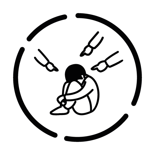- Mobbing / Konflikte – Person in einer schützenden Haltung, während Pfeile oder Finger auf sie zeigen, was Mobbing und zwischenmenschliche Konflikte darstellt.