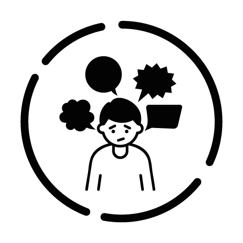 - Konzentrationsmangel – Person mit mehreren Gedankenblasen um den Kopf, die Ablenkung und Konzentrationsprobleme veranschaulichen.