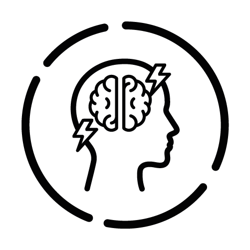 - Stress – Kopf mit einem angespannten Gehirn und Blitzen, die die Auswirkungen von Stress auf den Geist symbolisieren.